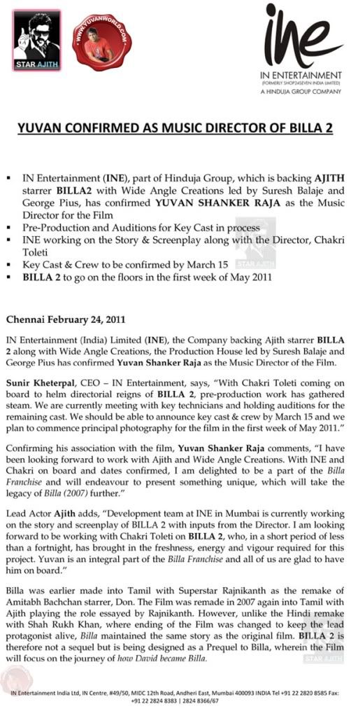 :: Yuvan signs Ajith's 53rd film with Siva | Pawan Kalyan appreciates Yuvan's work in Panjaa | Kazhugu audio out